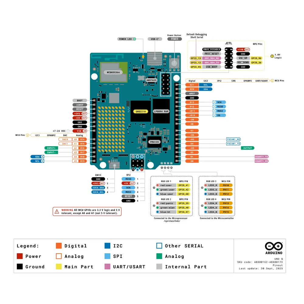 The UNO Q is Arduino’s newest hybrid board, designed to blend the power of a single-board computer with real-time microcontroller capabilities. Unlike classic Arduino boards, UNO Q pairs a Linux-capable processor with a microcontroller for deterministic control.